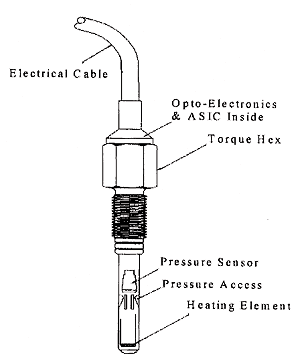 The opto-electronic module contains a photodiode, an LED, and a dedicated Application Specific Integrated Circuit (ASIC). Two input electrical pins are for power supply and ground while the output pin is for sensor output and fault diagnostics. The ASIC controls light intensity, amplifies and filters photodiode signal, and provides the auto referencing function. This Optrand patented technique regulates LED light intensity in response to any undesirable environmental conditions that may alter minimum detected light intensity. Baseline light intensity in fiber optic sensors may vary due to optical link transmission fluctuations resulting from connectors’ mechanical and thermal instabilities, fiber bending, light source or detector temperature dependence, or their aging over time. The auto-referencing approach not only corrects for offset drift but sensor gain error as well. A side benefit of the technique, not possible with other combustion pressure sensors, is the availability of sensor health monitoring output. By continuously monitoring the LED current level or its rate of change, one can identify potential sensor failure before it occurs. This ability is particularly important in control applications where sensor failure may cause malfunction or even failure of the controlled device.